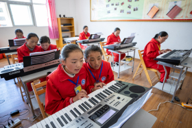 তিব্বত নাগকু শিক্ষার্থীরা অবসর সময়ে ইলেকট্রনিক পিয়ানো শেখে