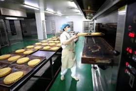 কারখানার কর্মীরা বড় মুনকেক বানিয়ে মধ্য-শরৎ উত্সবকে অভ্যর্থনা জানাচ্ছে।
