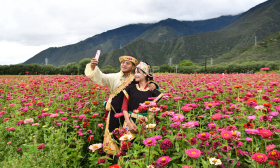 পর্যটকরা মুডো গ্রাম, মিরুই টাউনশিপ, নাইংচি শহরের ফুল বন্দরে ছবি তোলেন